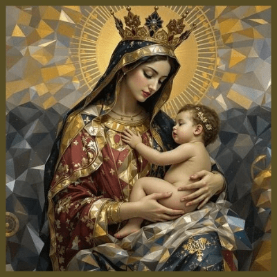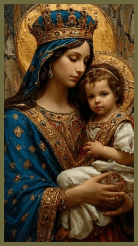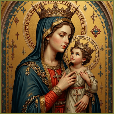 The doctrine of the Queenship of the Blessed Virgin Mary is rooted in the belief that Mary has a unique and elevated position in heaven, symbolized by her royal crown. According to this perspective, Mary’s throne is situated alongside that of her Son, Jesus Christ, which is essential for the restoration of the Davidic monarchy and kingdom. This connection is tied to God’s promise to David’s wife, Bathsheba. The theology surrounding Mary’s role is further supported by Scripture, particularly in the passage from the Song of Solomon 3:11, which describes a scene where King Solomon is crowned by his mother: “Go forth, ye daughters of Zion, and see King Solomon in the diadem wherewith his mother crowned him in the day of his espousals” This imagery is often interpreted as a foreshadowing of Mary’s role in the divine plan, reinforcing the belief in her Queenship and Christ’s eternal claim to the throne of David through the Divine Maternity.